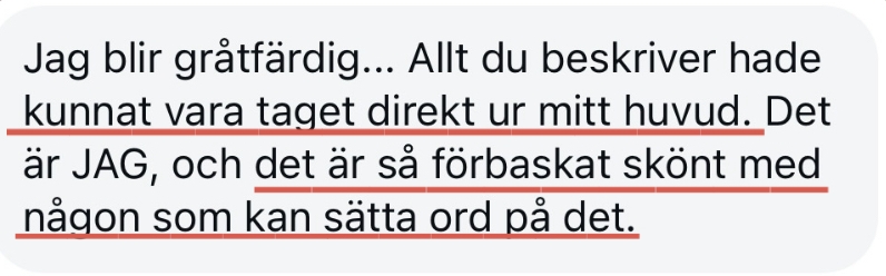 "Jag har fått en förståelse för adhd diagnos som jag fick sent i livet och varför jag är utmattad för andra gången. Bra att få skriva ner, jag ser ju nu svart på vitt vad som hänt 🙏" - Ullis
