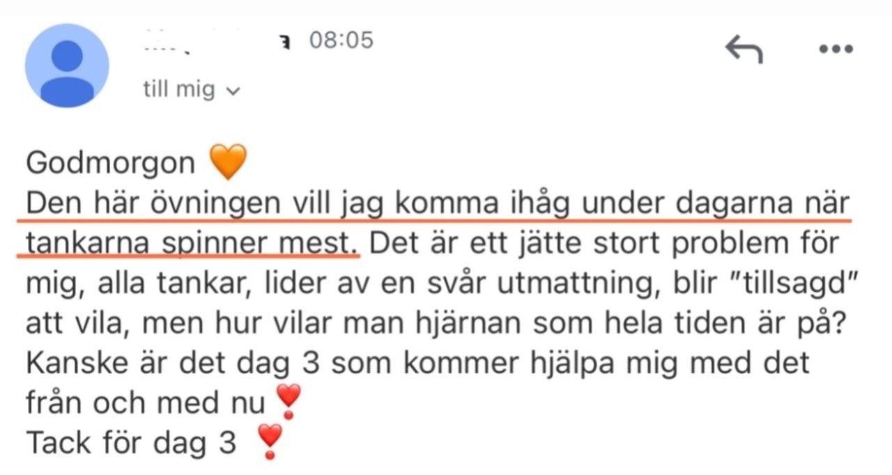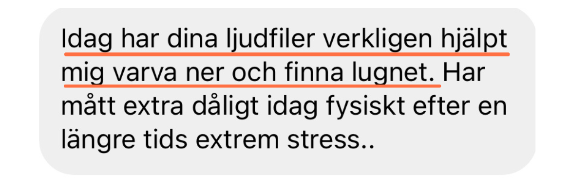 "Jag är långtidssjukskriven för b.la svår reaktion på långvarig stress. Sen jag började lyssna på Sabinas meditationer morgon och kväll har mitt höga blodtryck gått ner."