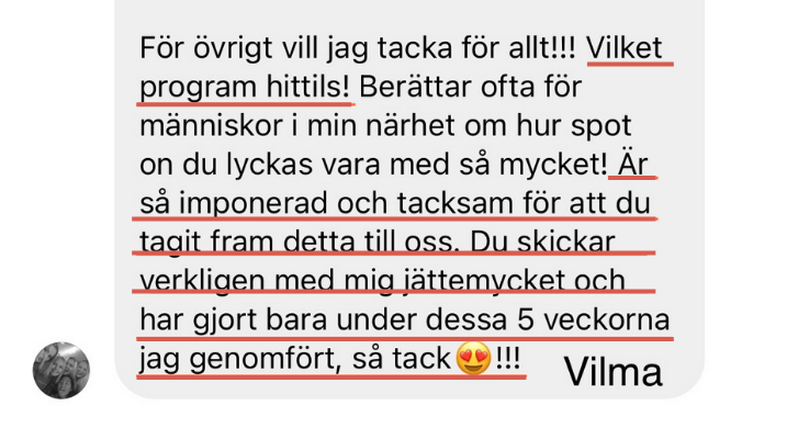 De allra flesta kvinnor som går programmet känner under programmets gång att den här stunden, de här 30 minutrarna är något hon längtar till - en stund som bara är hennes och inte längre ett krav. Du kommer också att uppleva skiftet, det är mindblowing som en av de tidigare deltagarna skrev i ett omdöme.